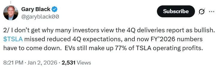 However, not everyone is sold on the optimism surrounding Tesla. Gary Black, Managing Partner at The Future Fund, stated in a post on X that he does not get why many investors view Tesla’s Q4 deliveries report as bullish.