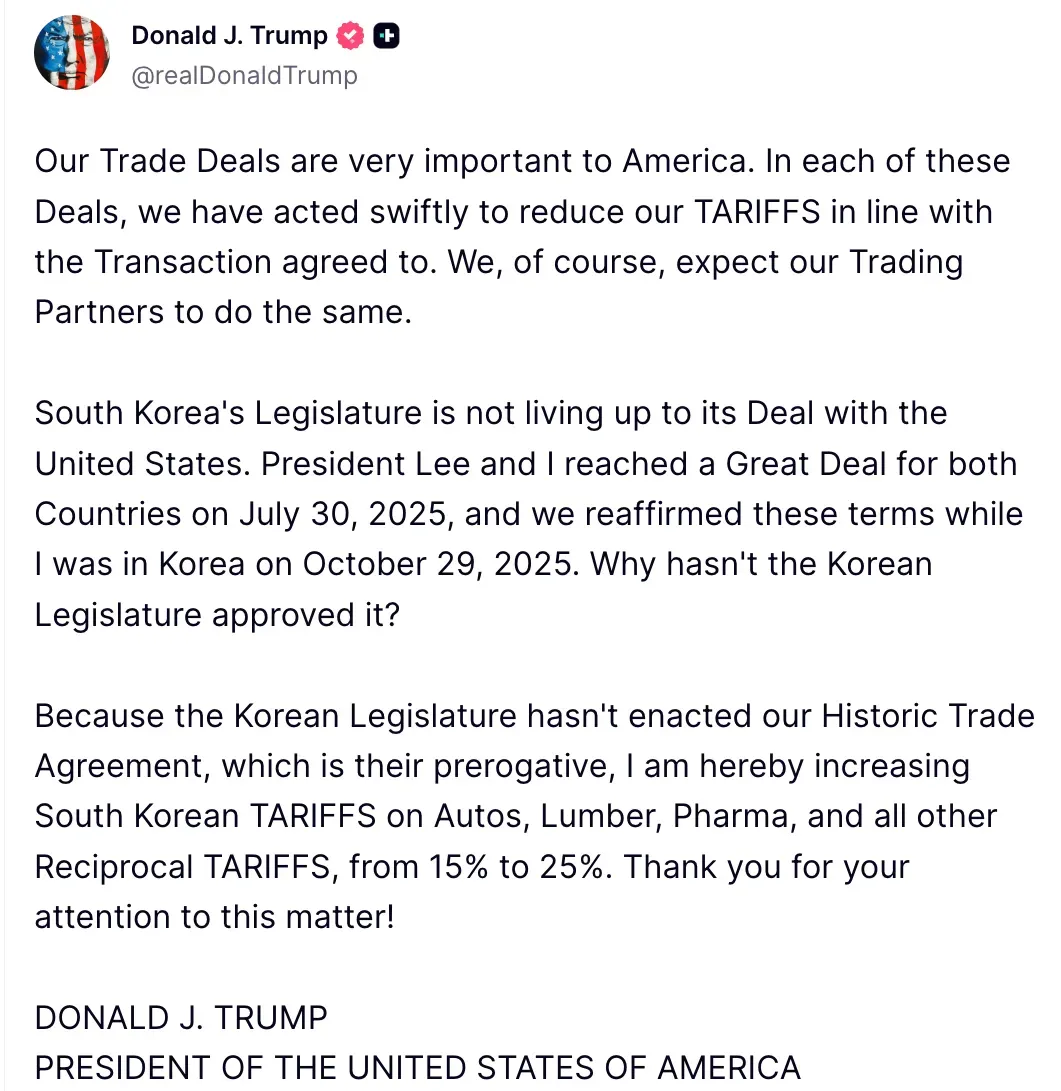 “Because the Korean Legislature hasn't enacted our Historic Trade Agreement, which is their prerogative, I am hereby increasing South Korean TARIFFS on Autos, Lumber, Pharma, and all other Reciprocal TARIFFS, from 15% to 25%,” the President added.