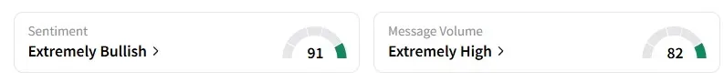 Retail sentiment turned "extremely bullish" a day ago on Stocktwits amid high message volume.
