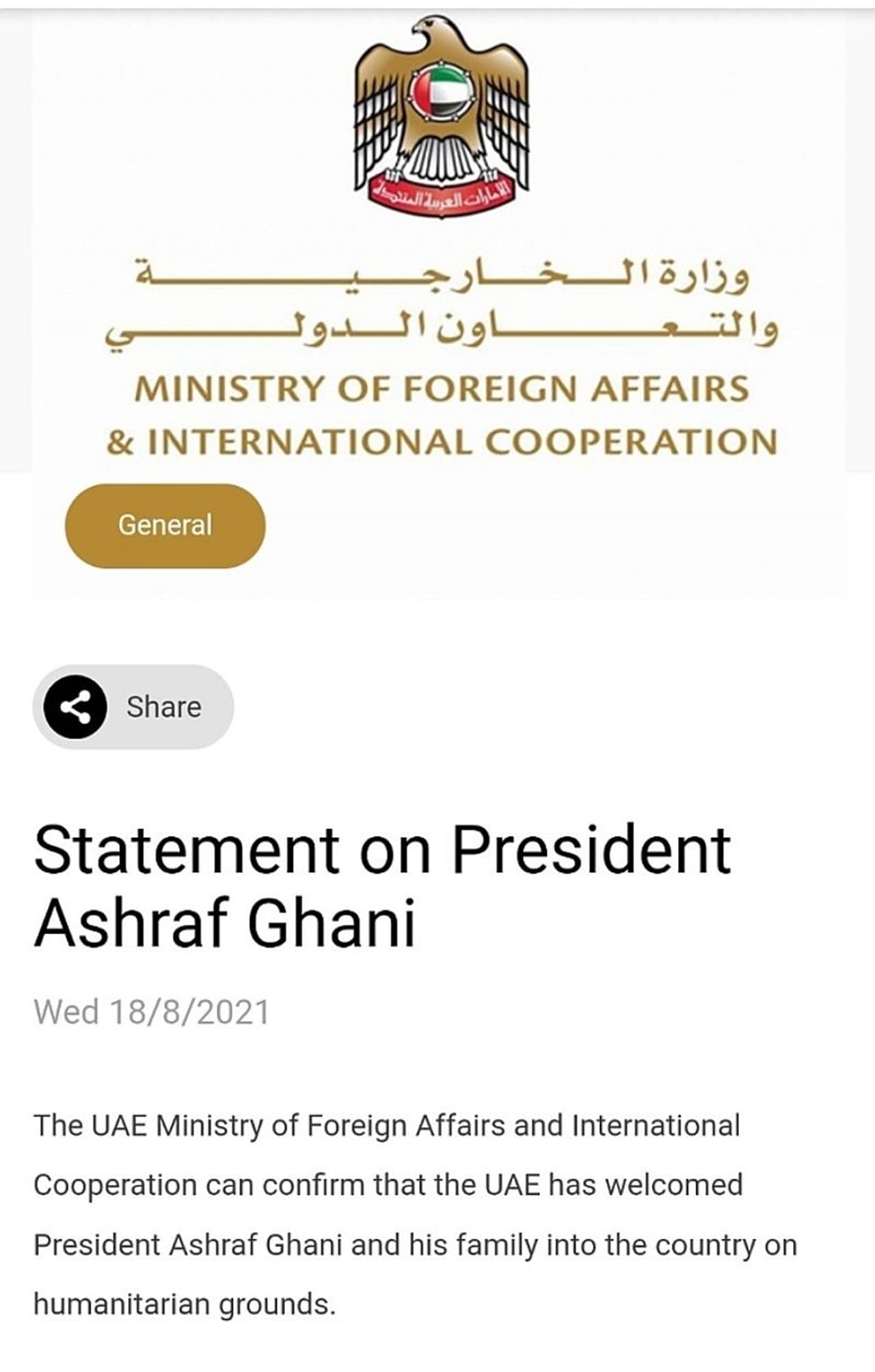 In a statement, UAE foreign ministry confirmed that the UAE has welcomed Ashraf Ghani and his family into the country on humanitarian grounds.