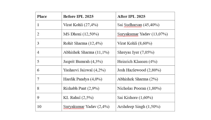 Suryakumar Yadav also had a great season. After IPL 2025, he gained 10% more votes compared to the survey before the season and moved up from 10th place to second in the rankings. This rise was helped by votes from fans in Uttar Pradesh (12.50%), even though he was born in and plays for the Maharashtra team (9.87%).