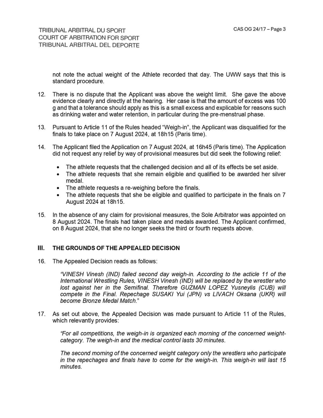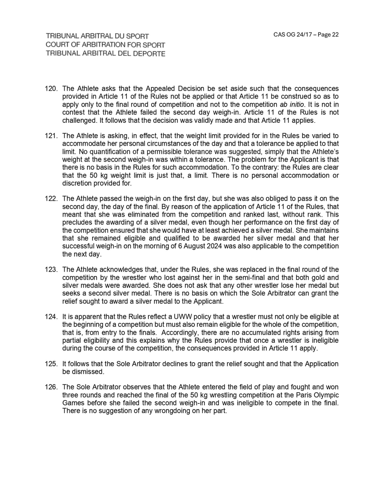 The Court of Arbitration for Sport (CAS) while rejecting wrestler Vinesh Phogat's appeal against her disqualification at the Paris Olympics, emphasized that it is the athlete's responsibility to adhere to the weight limit. While no relief was granted on this basis, the CAS described the consequence of failing the weigh-in on the second day as "draconian."