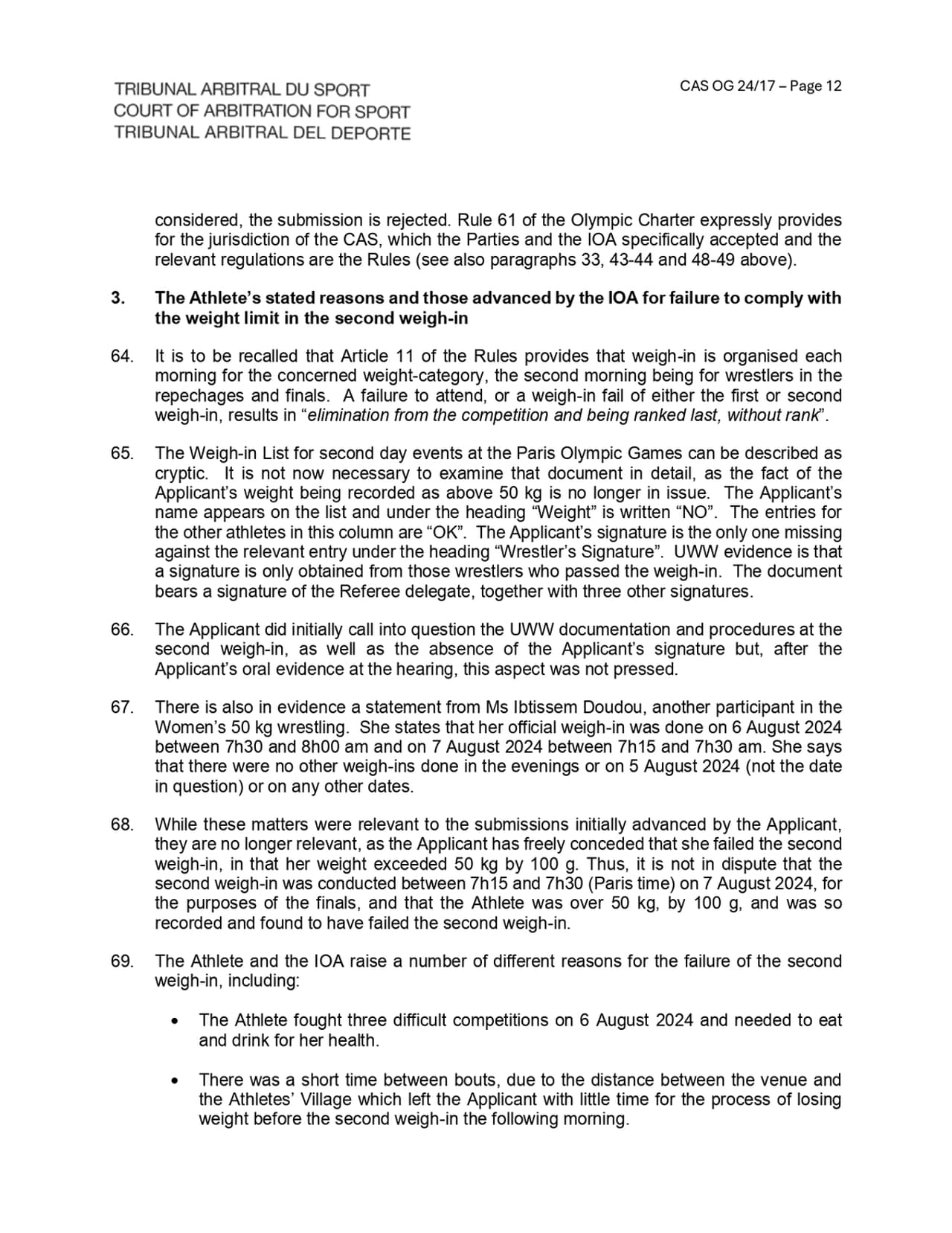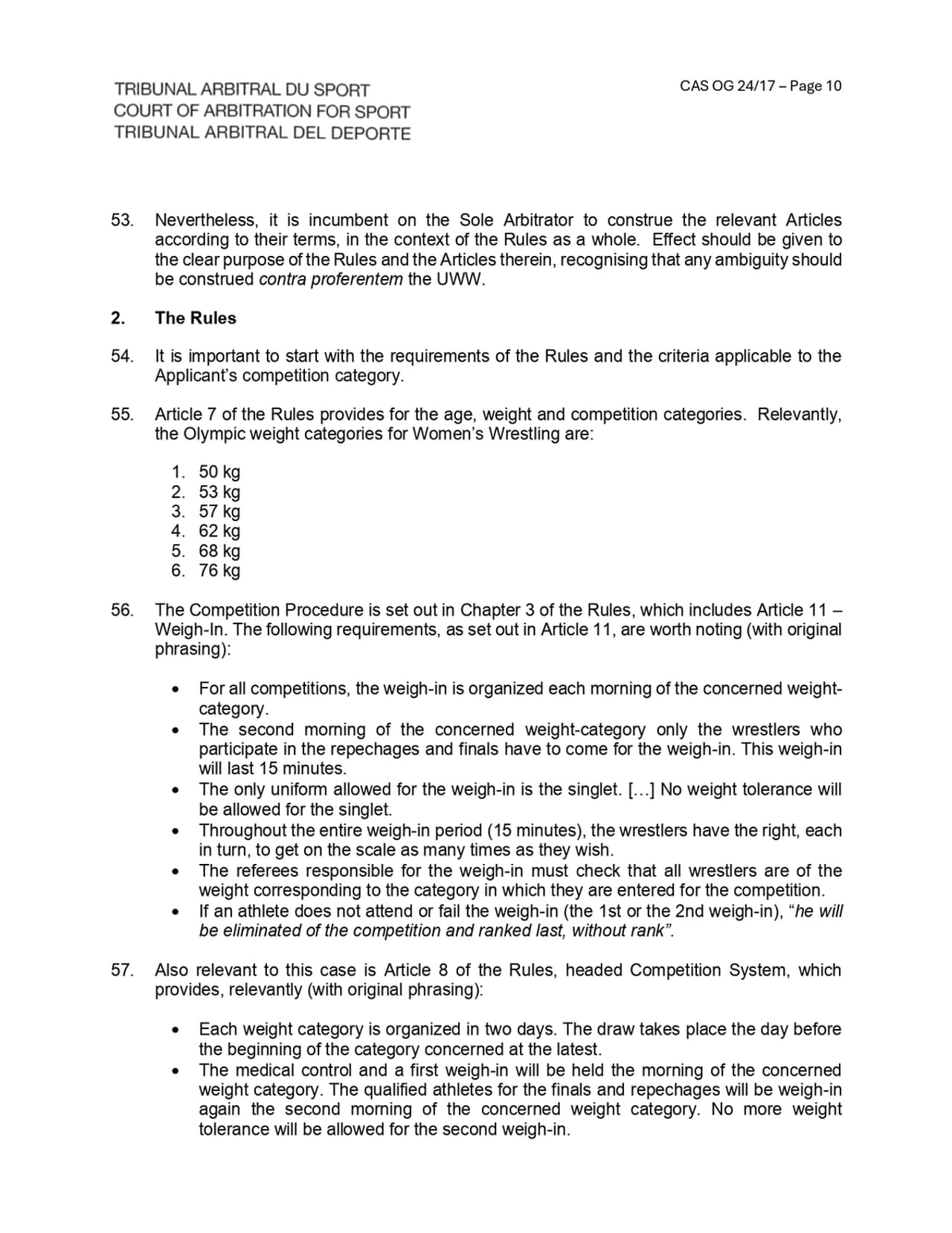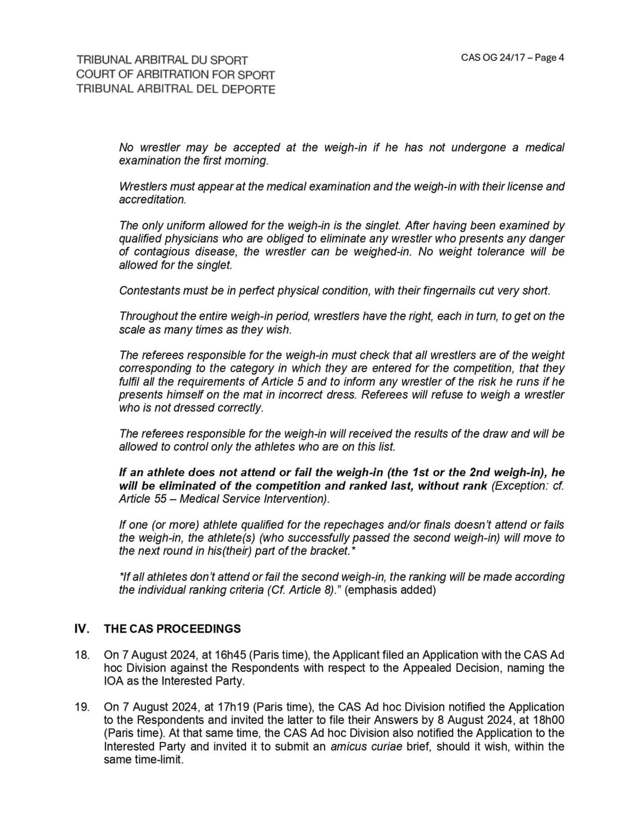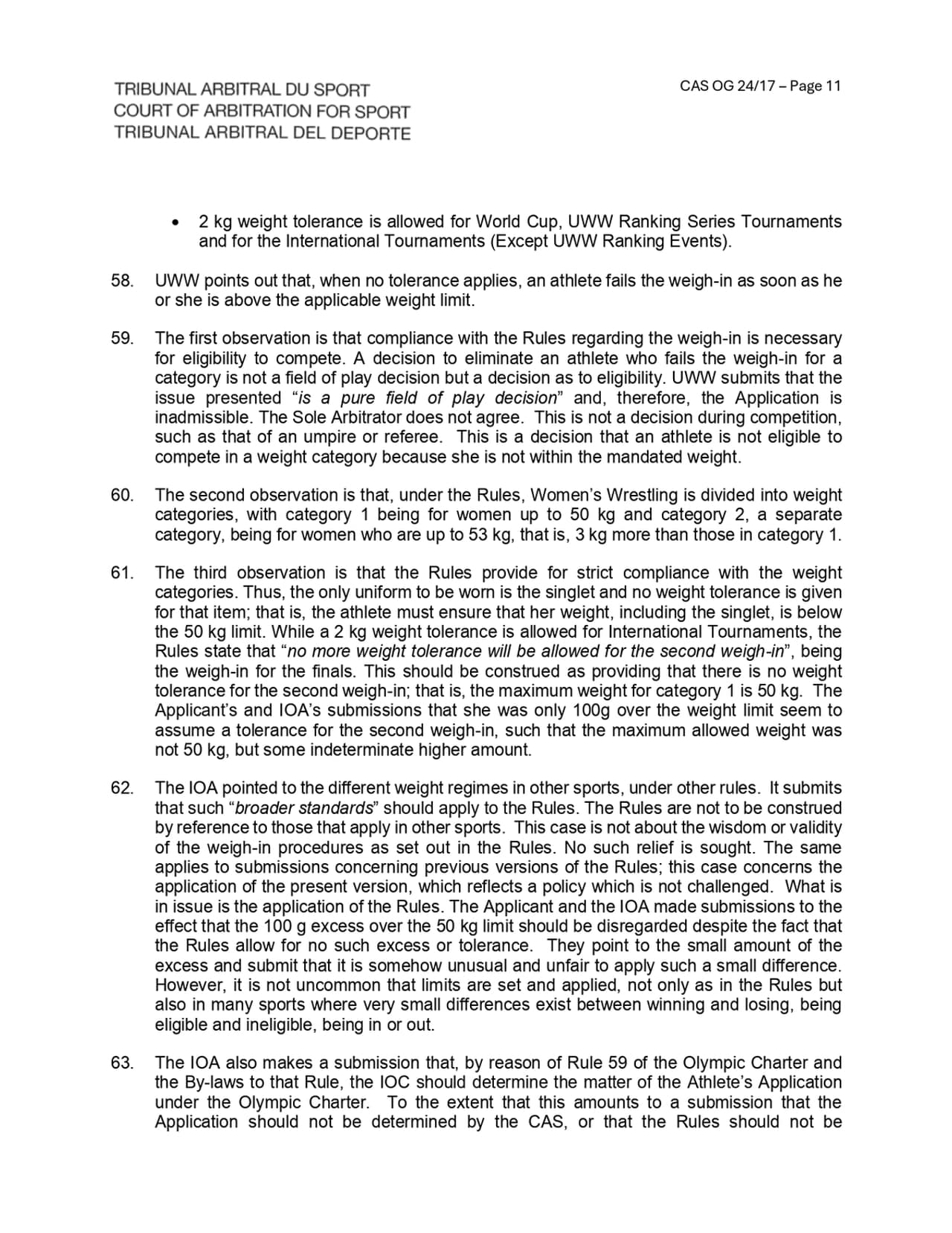 "Article 7 of the Rules provides, relevantly, that each contestant is deemed to be taking part of her own free will and is responsible for herself and is entitled to compete in only one weight category, the one corresponding to her weight at the time of the official weigh-in," the detailed CAS order, which was published on Monday, stated.