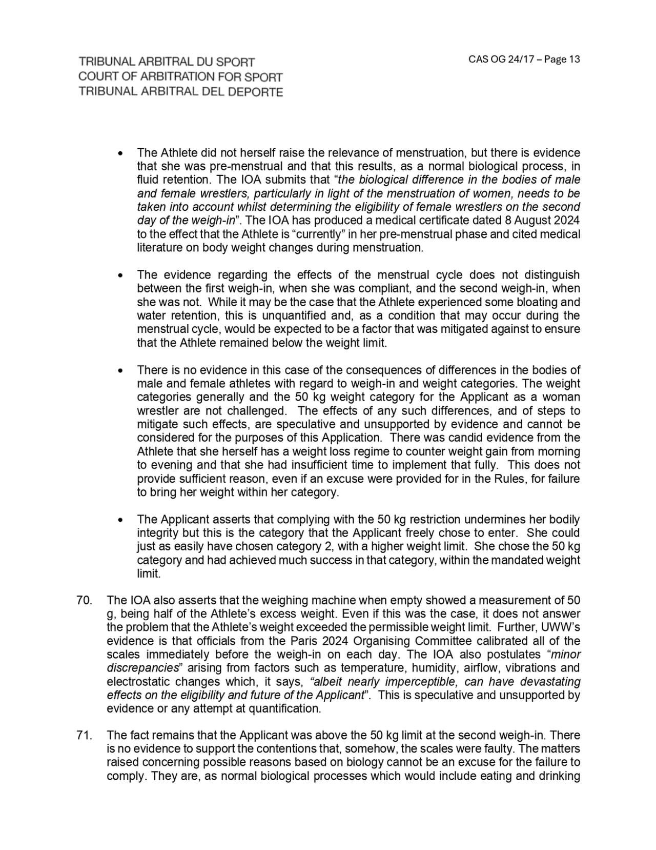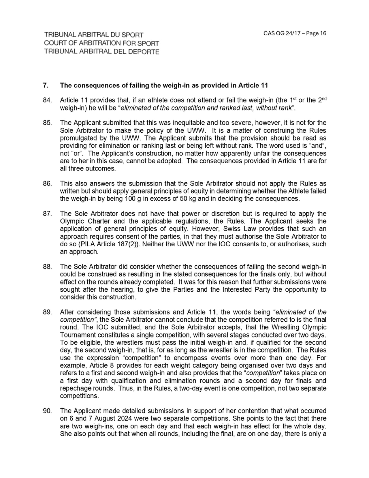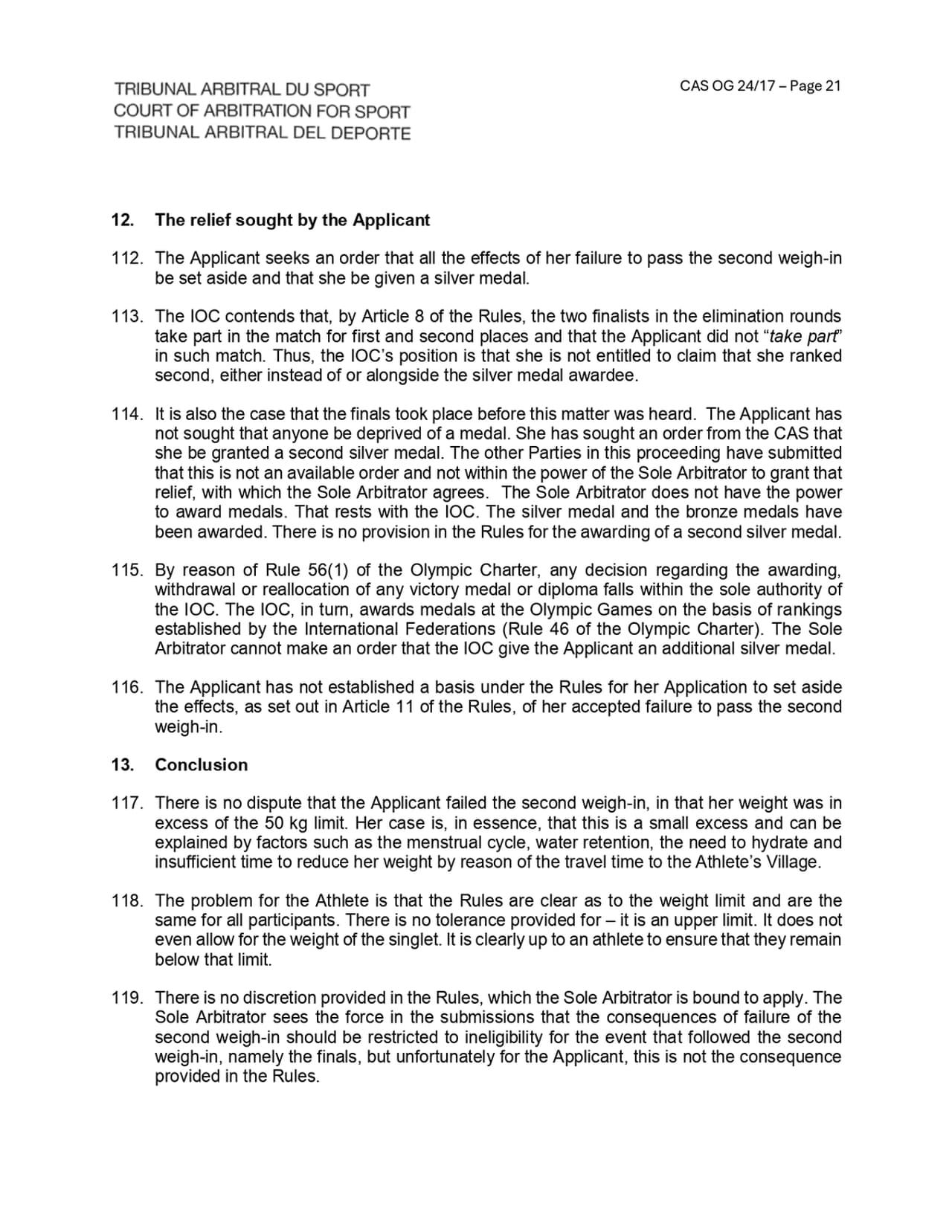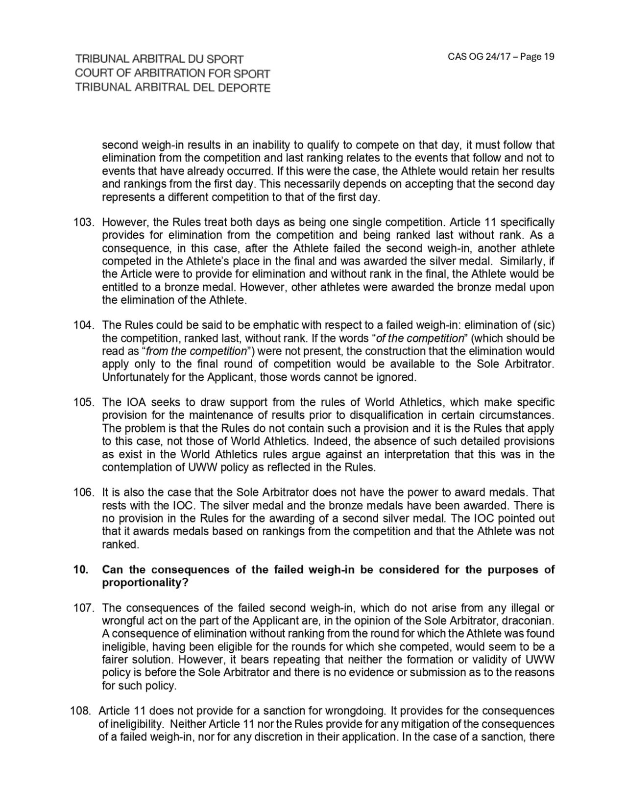 "Article 7 of the Rules provides, relevantly, that each contestant is deemed to be taking part of her own free will and is responsible for herself and is entitled to compete in only one weight category, the one corresponding to her weight at the time of the official weigh-in," the detailed CAS order, which was published on Monday, stated.