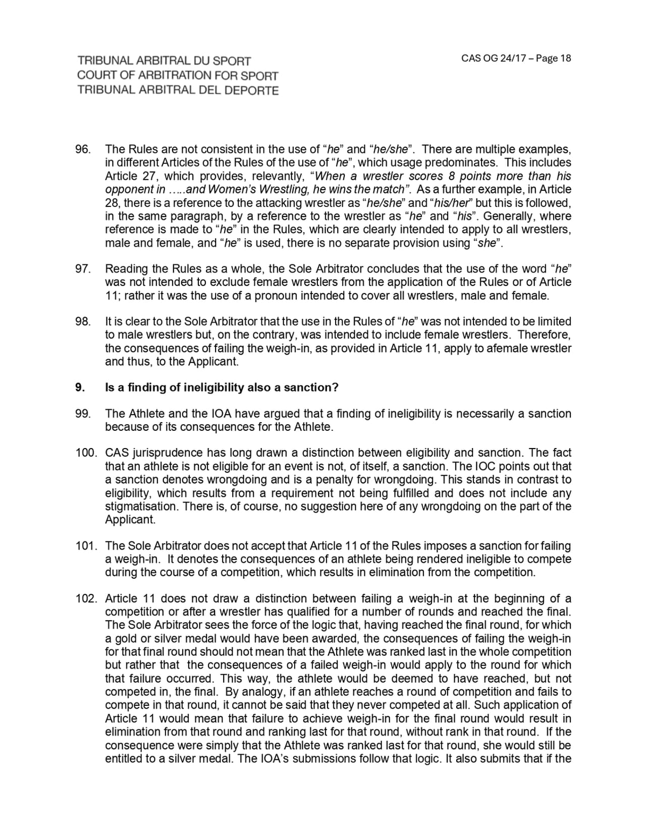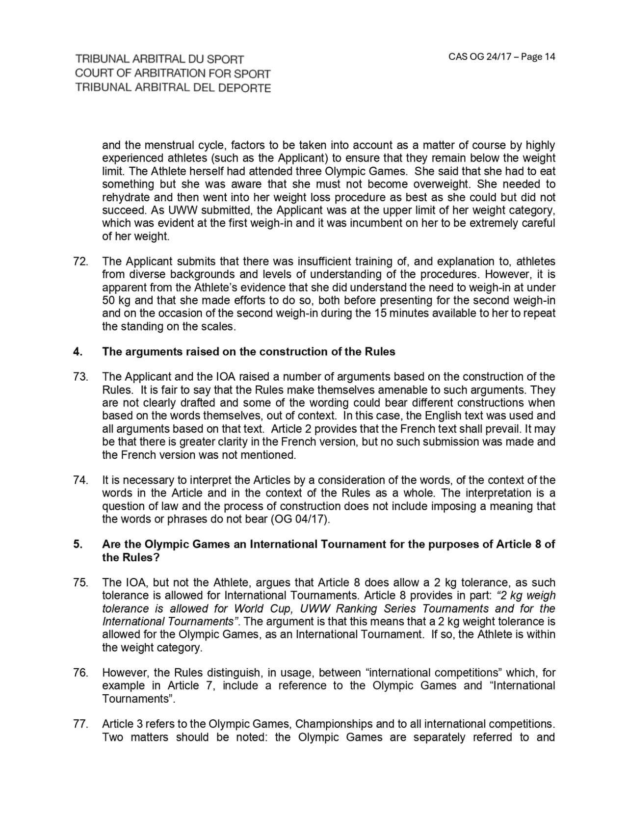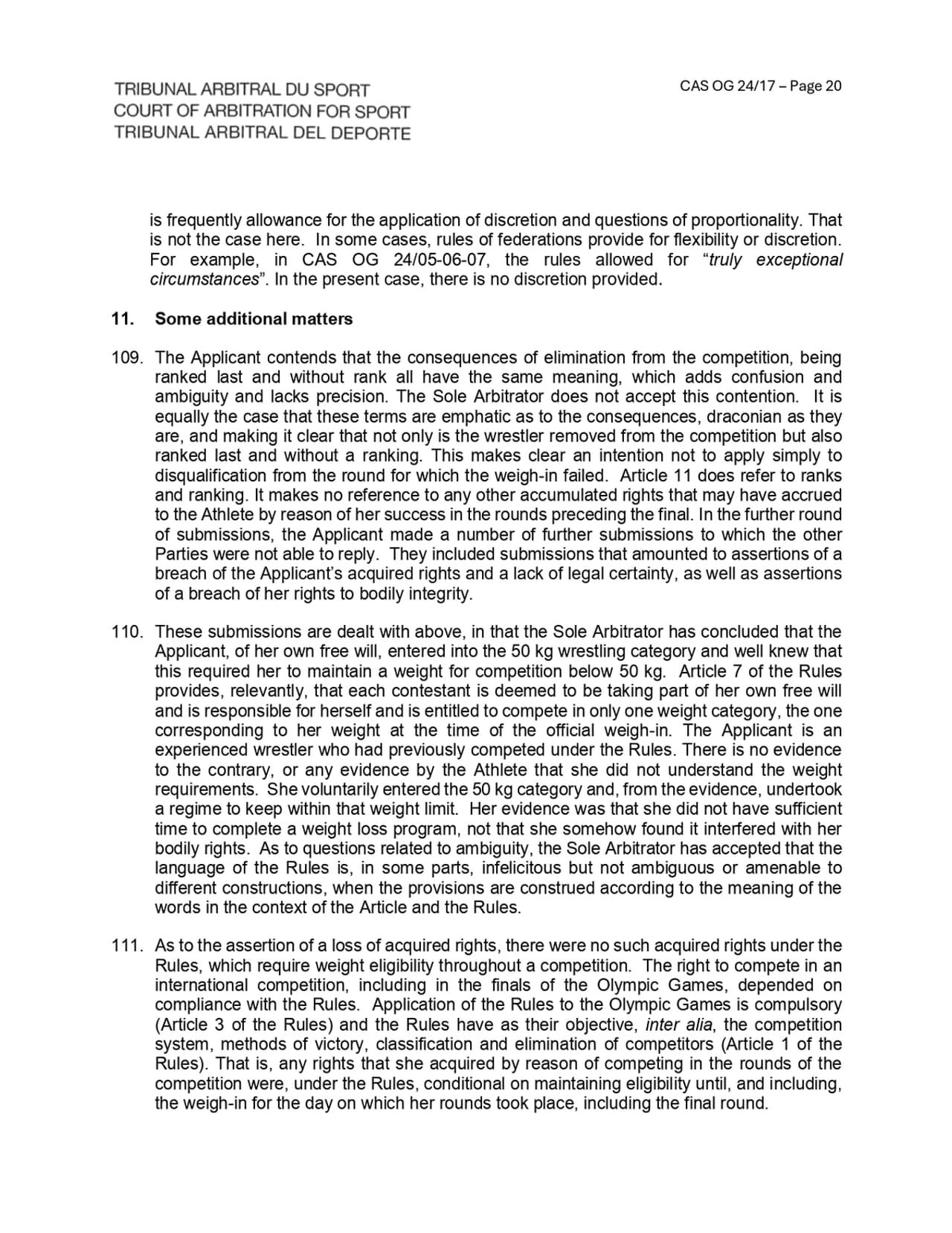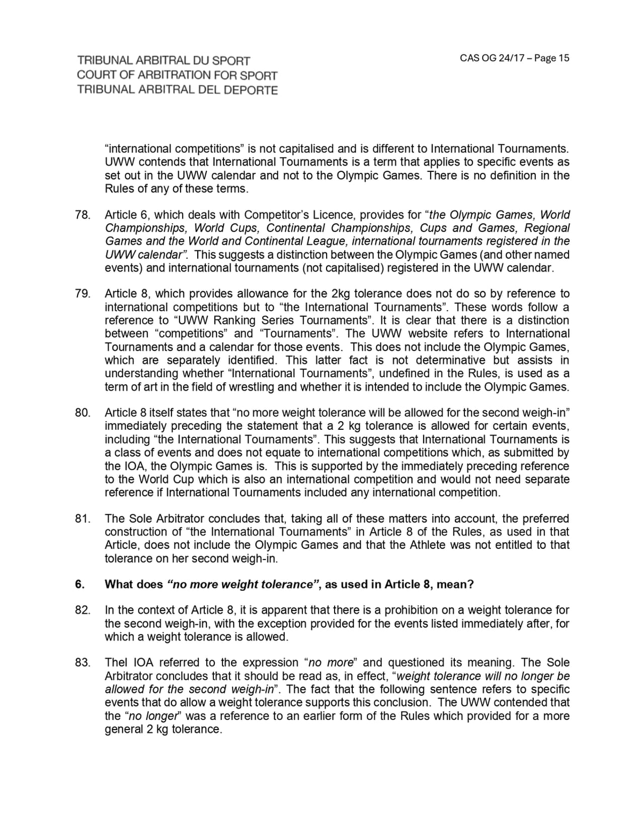"Article 7 of the Rules provides, relevantly, that each contestant is deemed to be taking part of her own free will and is responsible for herself and is entitled to compete in only one weight category, the one corresponding to her weight at the time of the official weigh-in," the detailed CAS order, which was published on Monday, stated.