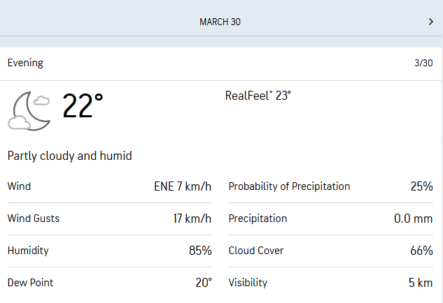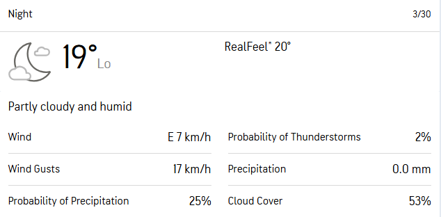 In the night, the possibility of precipitation is likely to be at 25%, with a cloud cover at 53%, and temperatures expected to hover around 19 degrees Celcius, indicating that the conditions should largely remain comfortable to players and the spectators, with only a slight chance of rain disrupting the match later in the evening.