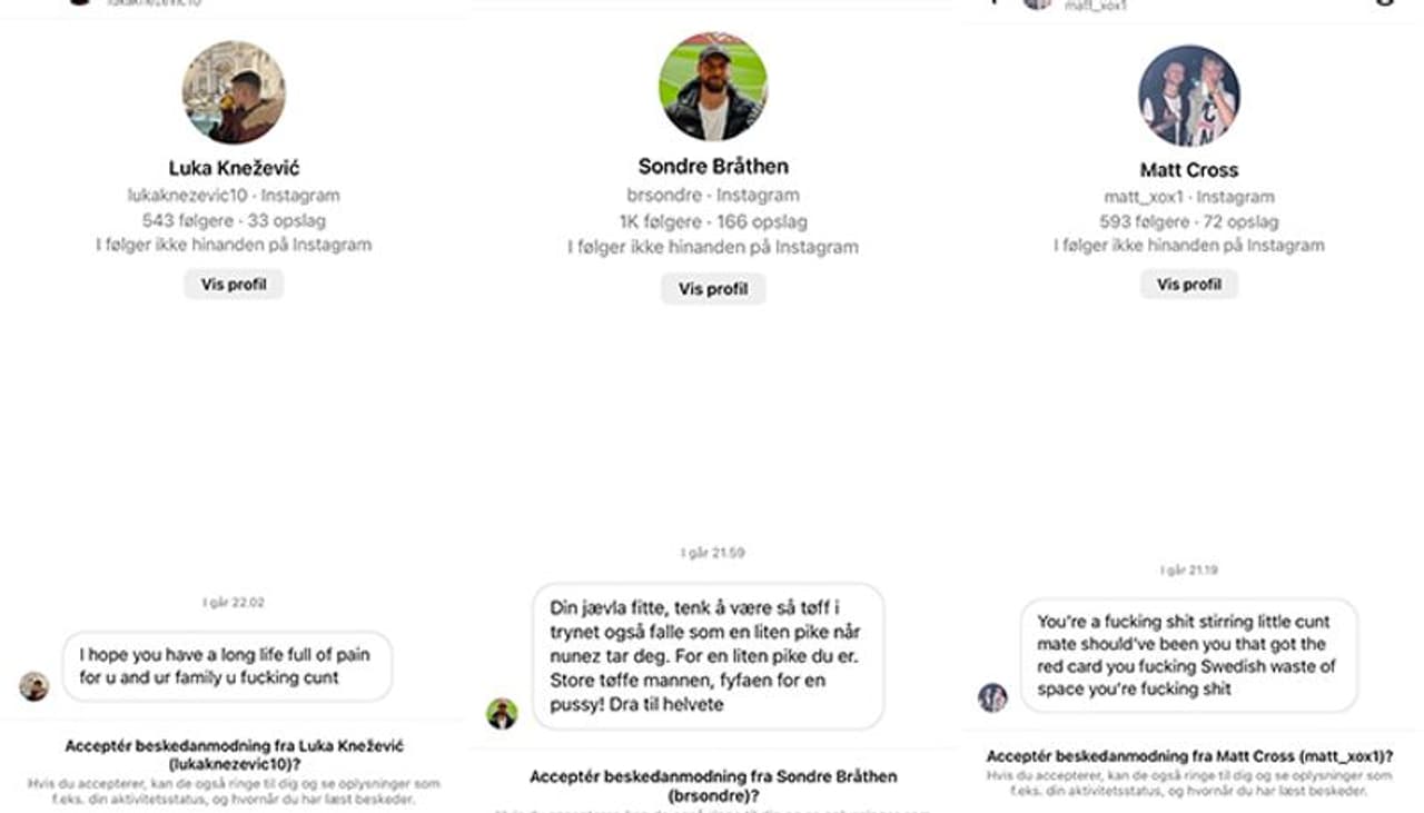 "Got maybe 300 to 400 of these messages last night," Andersen revealed on Instagram while sharing 17 screenshots of death threats and abusive direct messages received last night.
