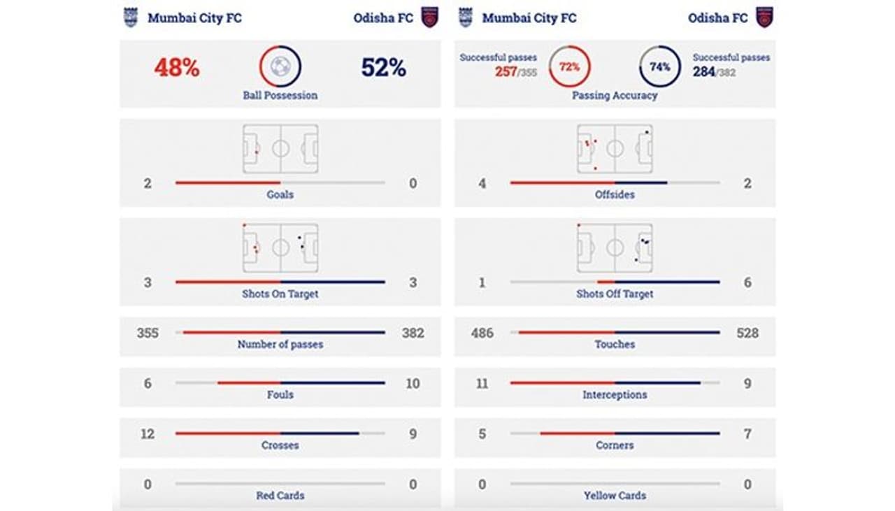 The first shot on target came seven minutes from half-time when Nandhakumar Sekar cut in from the left flank and fired a tame effort towards the goal. It was comfortably collected by the keeper. In the 44th minute, Diego Mauricio burst into life as he sprinted past two Mumbai City players before getting a shot away. The Brazilianās effort was off target.