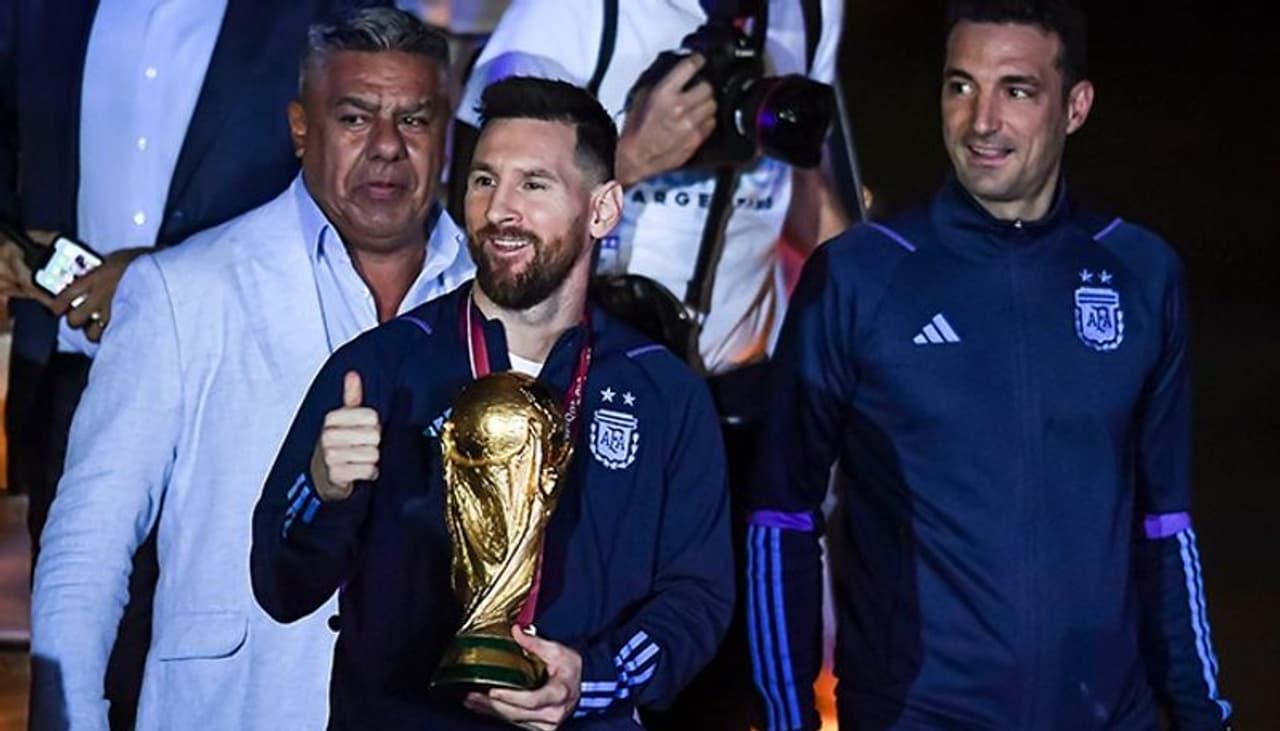 First off the plane carrying the World Cup was Messi, who was escorted by coach Lionel Scaloni. Scaloni wrapped his arm around the captain as they passed a placard that read, "Thank you, champions."