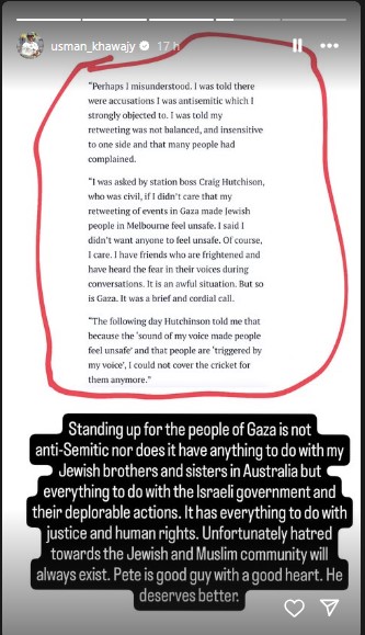 Upon hearing the news of an Australian journalist getting sacked from his job for his social media post supporting Palestine, Usman Khawaja took to his Instagram story and expressed his shock over Peter Lalor’s termination by SEN Radio. Khawaja stated that standing up for Palestine has nothing to do with the Jewish people in Australia. He added that Peter deserves better treatment as he is a guy with a good heart.