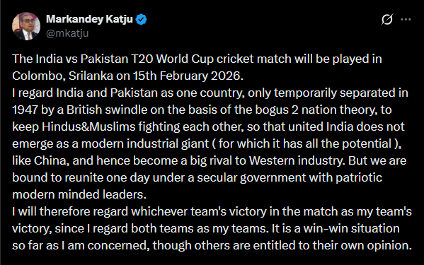 As Team India will take on Pakistan in the much-anticipated clash of the T20 World Cup 2026, former Supreme Court Judge Markandey Katju expressed a unique perspective amid the hype and excitement around the marquee fixture.