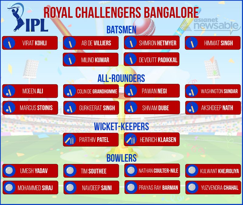 Virat Kohli (Captain), AB de Villiers, Parthiv Patel, Yuzvendra Chahal, Tim Southee, Umesh Yadav, Navdeep Saini, Kulwant Khejroliya, Washington Sundar, Pawan Negi, Nathan Coulter-Nile, Moeen Ali, Mohammed Siraj, Colin de Grandhomme, Shimron Hetmyer, Devdutt Padikkal, Shivam Dube, Heinrich Klassen, Gurkeerat Singh, Himmat Singh, Prayas Ray Barman, Mandeep Singh.