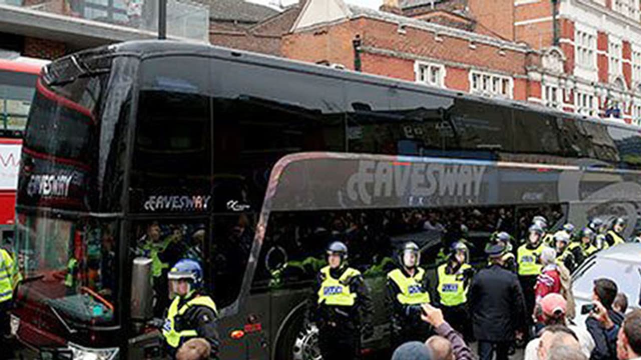 Raucous fans outside the Boleyn Ground turned violent and hurled bottles and beverage cans at the vehicle, shattering the windows.