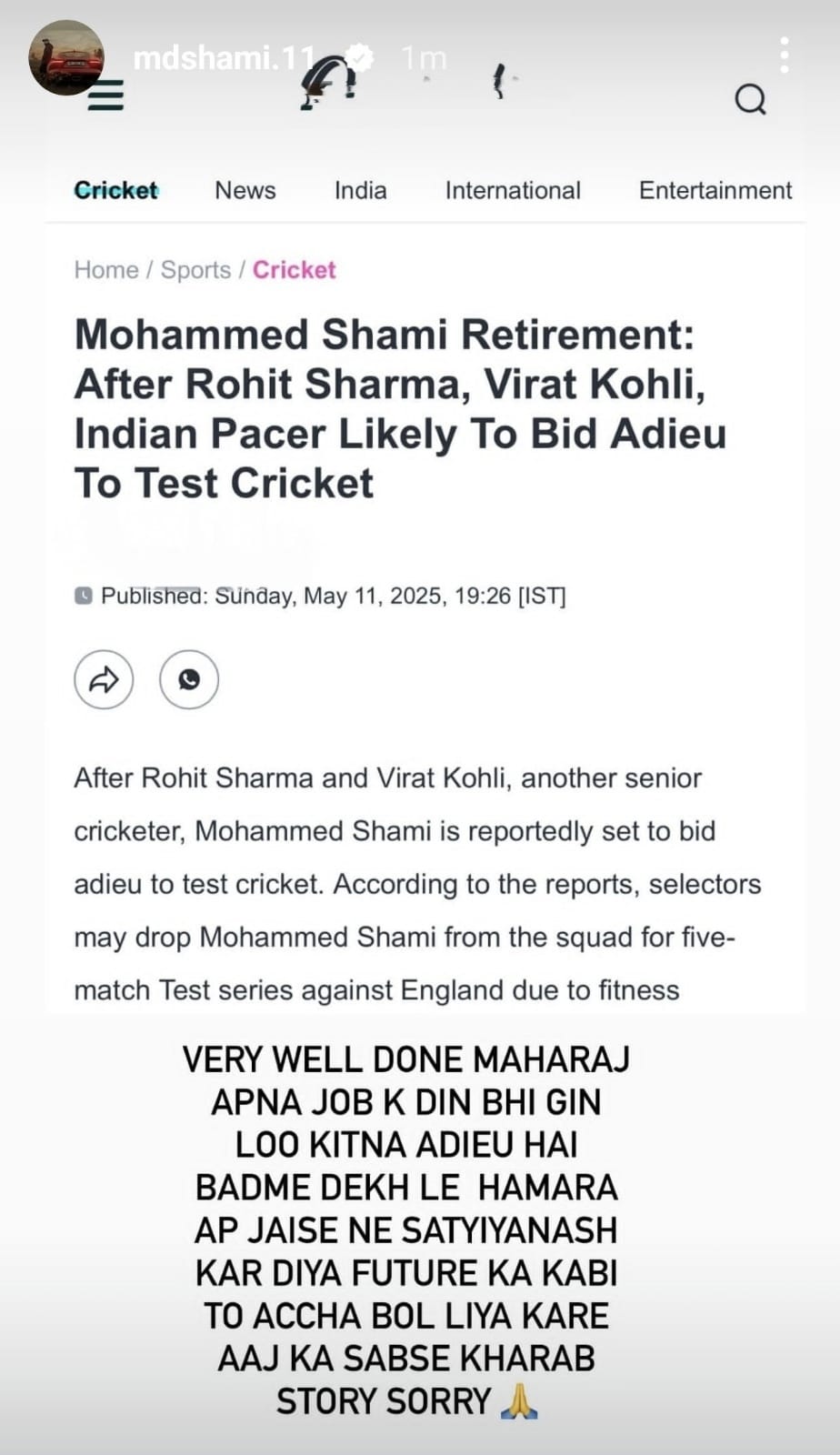Team India veteran pacer Mohammed Shami lashed out at the report hinting at his potential retirement from Test cricket ahead of the England Tour. The five-match Test series against England is scheduled to take place on June 20 and the India squad is expected to be announced by BCCI chief selector Ajit Agarkar by fourth week of May, along with unveiling of new Test captain.
