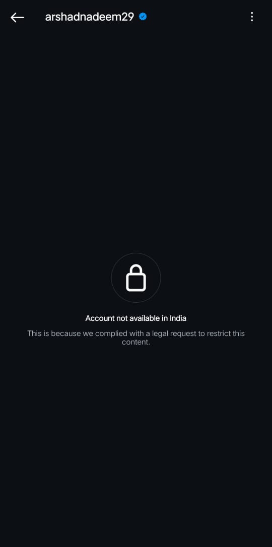 Instagram received a legal request to restrict the content of Arshad Nadeem on the platform and conducted legal and human rights assessment before geo-blocking the account in India in accordance with local laws and platform policies.