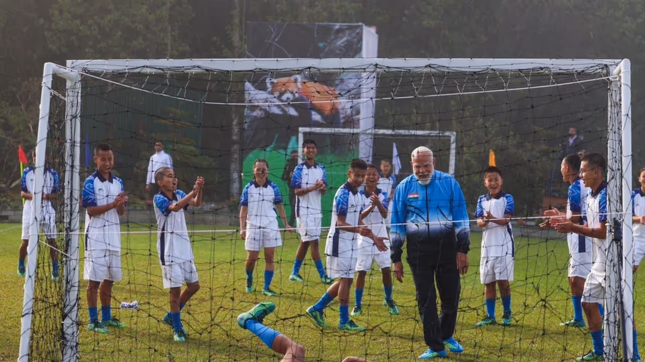 Prime Minister Narendra Modi on Tuesday shared glimpses of himself playing football with youngsters in Gangtok, highlighting a lighter moment during his visit to the northeastern state.
