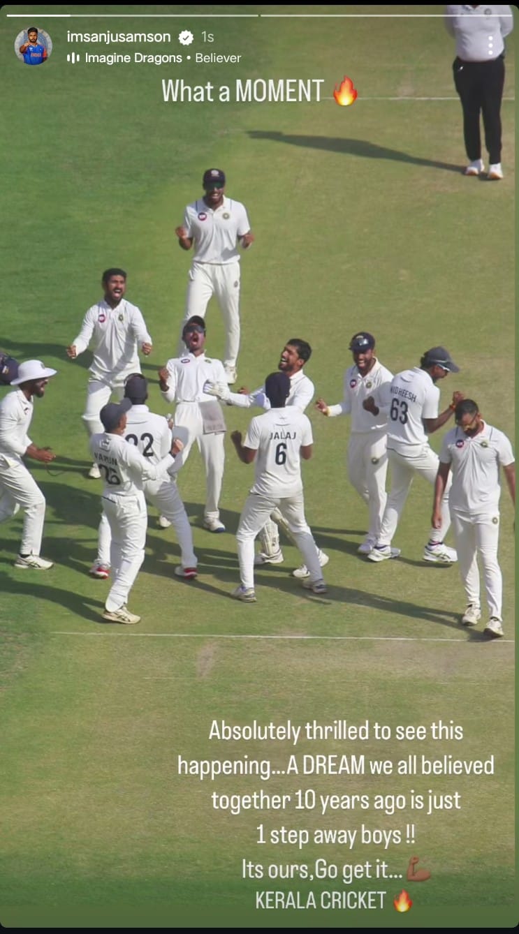 Team India wicketkeeper-batter Sanju Samson has posted a heartfelt message after Kerala made it to their maiden Ranji Trophy final by defeating Gujarat with first innings lead in the semifinal at the Narendra Modi Stadium in Ahmedabad on Friday, February 21.