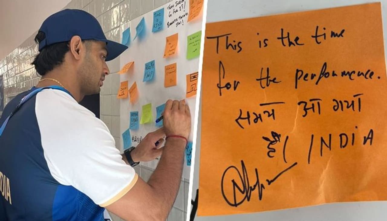 In the post, Neeraj Chopra is seen writing a note for his compatriots which read, "This is the time for the performance. Samay aa gaya hai India."
