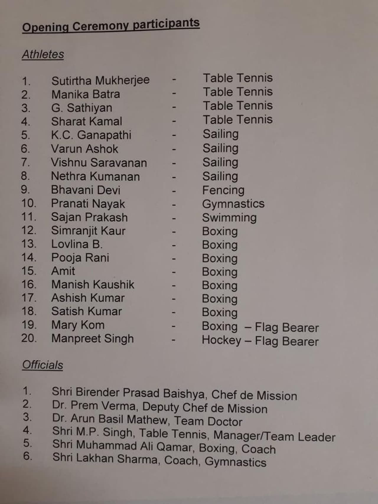 Athletes: Sutirtha Mukherjee (Table Tennis), Manika Batra (TT), G Sathiyan (TT), Sharat Kamal (TT), KC Ganapathi (Sailing), Varun Ashok (Sailing), Vishnu Saravanan (Sailing), Nethra Kumanan (Sailing), Bhavani Devi (Fencing), Pranati Nayak (Gymnastics), Sajan Prakash (Swimming), Simranjit Kaur (Boxing), Lovlina B (Boxing), Pooja Rani (Boxing), Amit (Boxing), Manish Kaushik (Boxing), Ashish Kumar (Boxing), Satish Kumar (Boxing), Mary Kom (Boxing - Flag Bearer) and Manpreet Singh (Hockey - Flag Bearer).