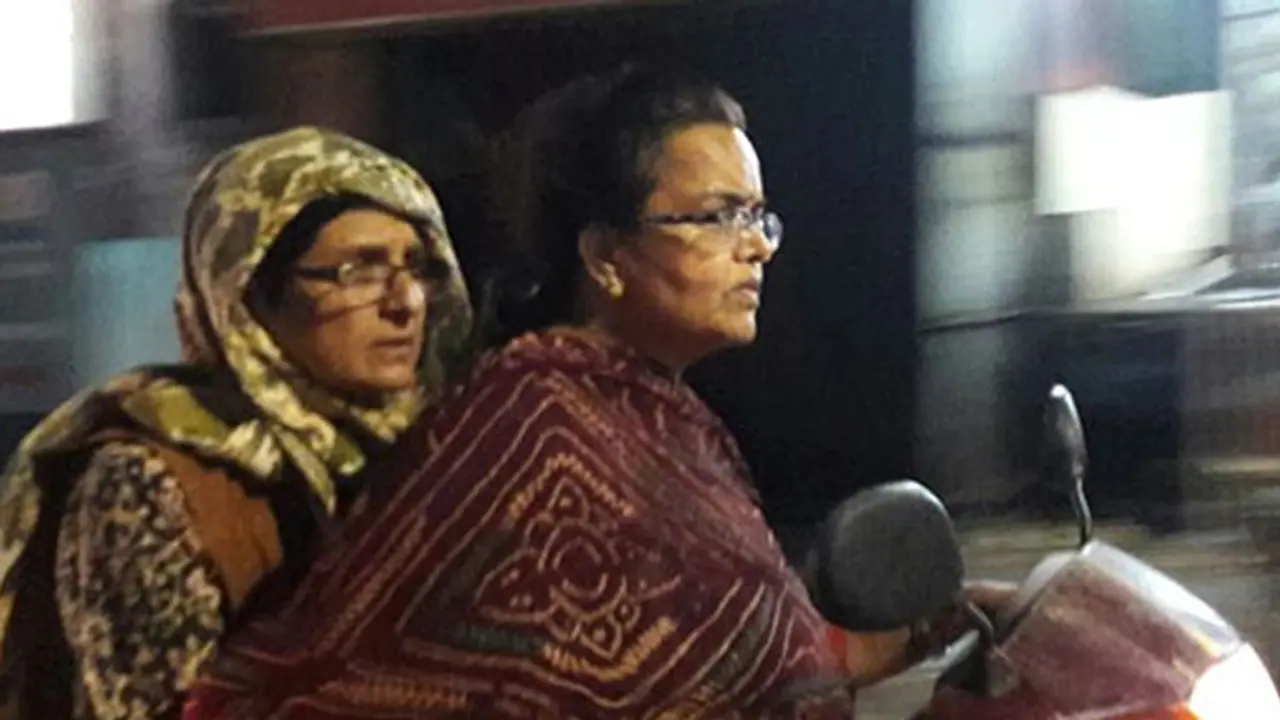 The image shows Bedi riding pillion on a two-wheeler with shawl covering her face. Bedi later also put out a message on the WhatsApp to journalists stating that she felt that the city was safe for women at night.