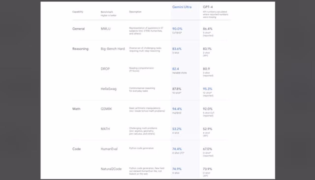 Gemini was tested in the areas of General, Reasoning, Math, and Code to see how well it interacts with texts. Image, video, and audio benchmark tests were performed to assess the LLM's multimodal capabilities. And, with the exception of "HellaSwag," which is characterised as "common sense reasoning for everyday tasks," Gemini has outperformed ChatGPT in all tests.