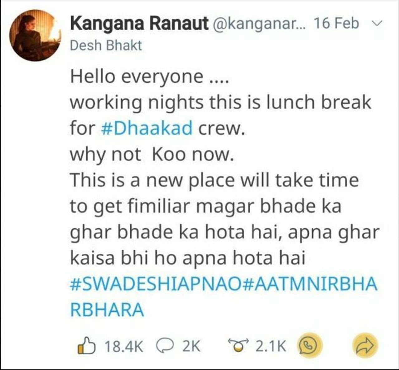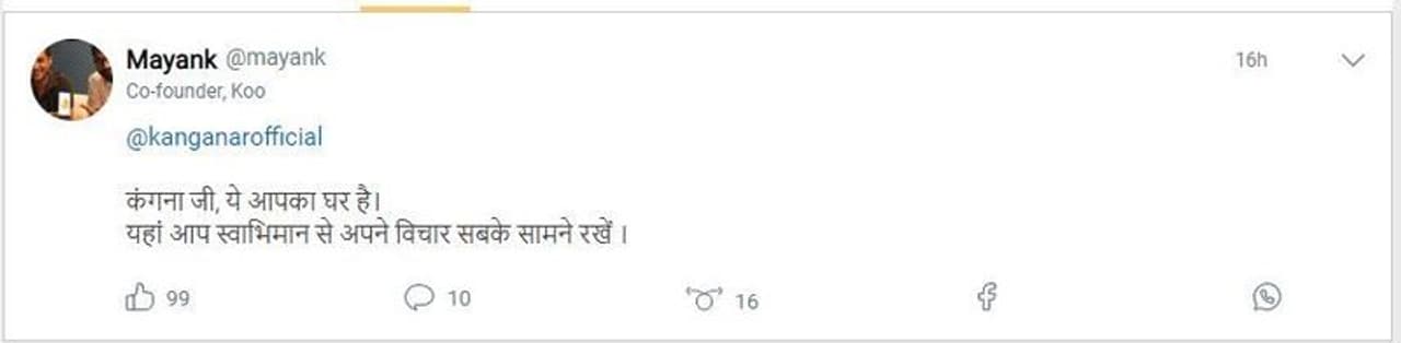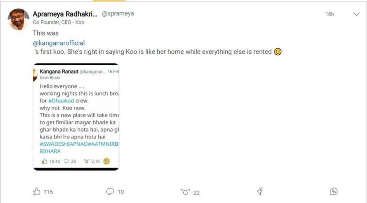 And, recently the founder of the app reshared her post, saying, "This was @kanganarofficial's first koo. She's right in saying Koo is like her home while everything else is rented."