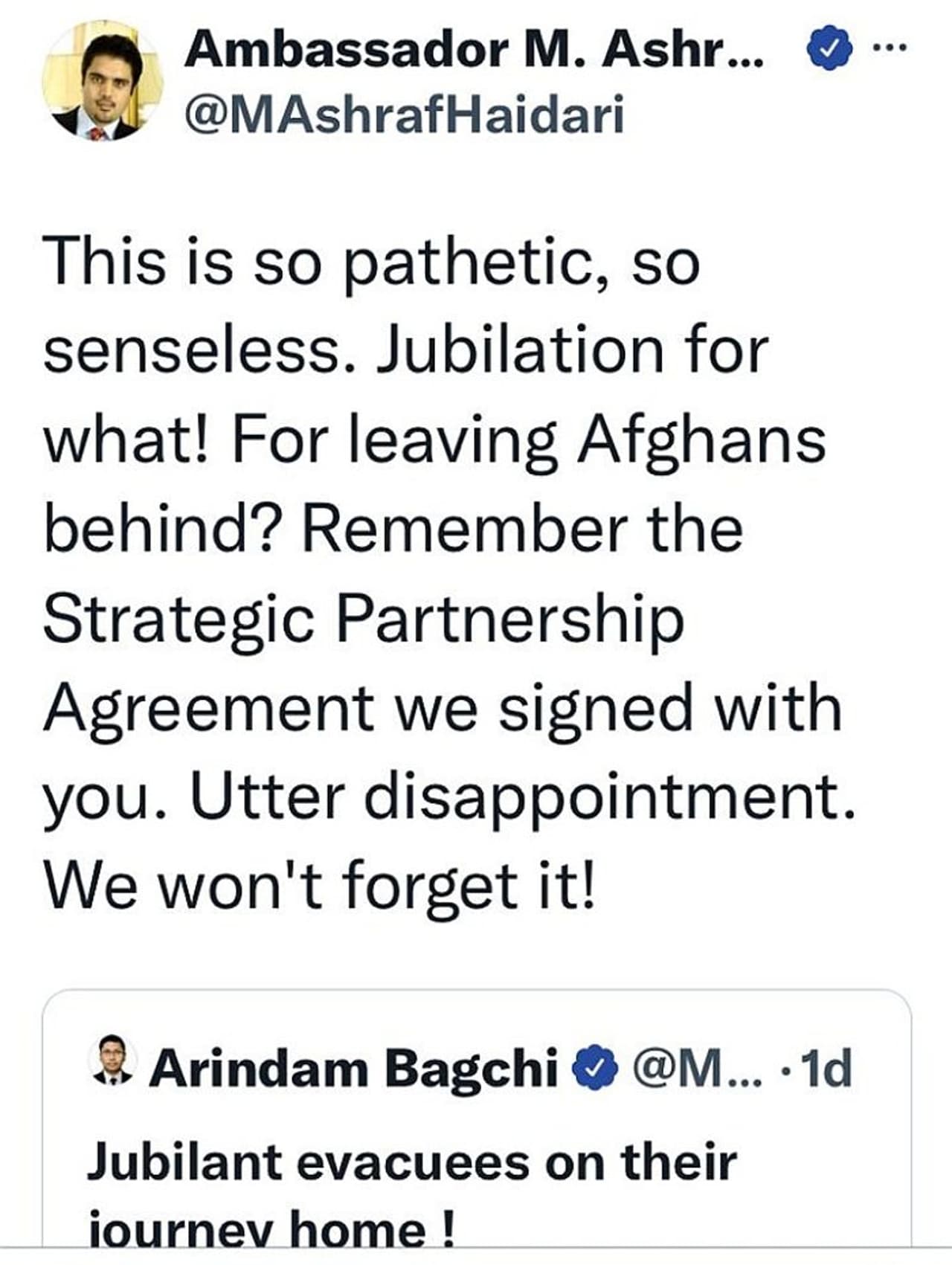 In a Twitter post that he deleted later, Haidari said, "This is so pathetic, so senseless. Jubilation for what! For leaving Afghans behind? Remember the Strategic Partnership Agreement we signed. Utter disappointment. We won't forget it!"