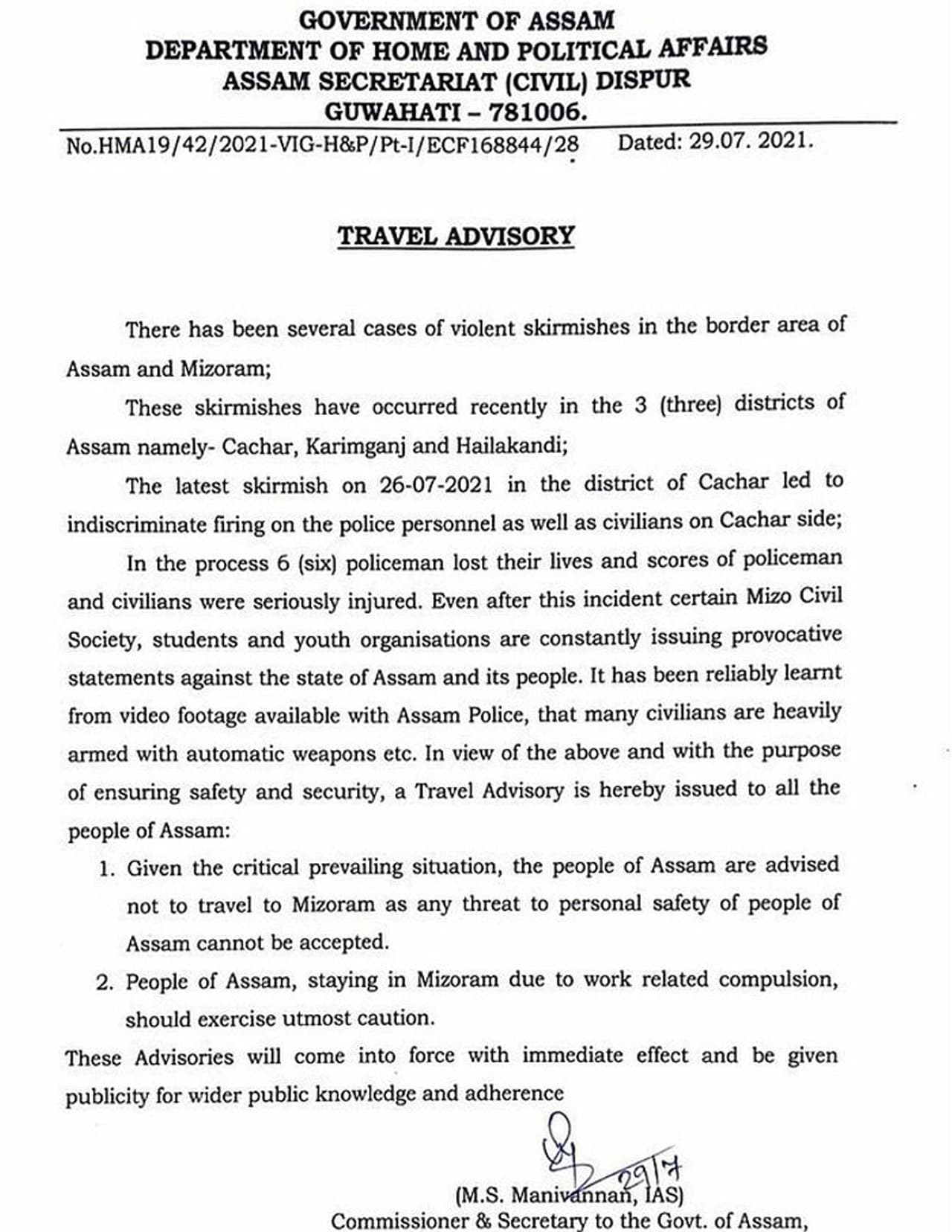 The advisory, signed by state Home Secretary MS Manivannan, noted that some Mizo civil society, student and youth organisations have been issuing provocative statements against Assam and its people.