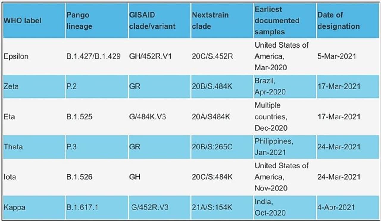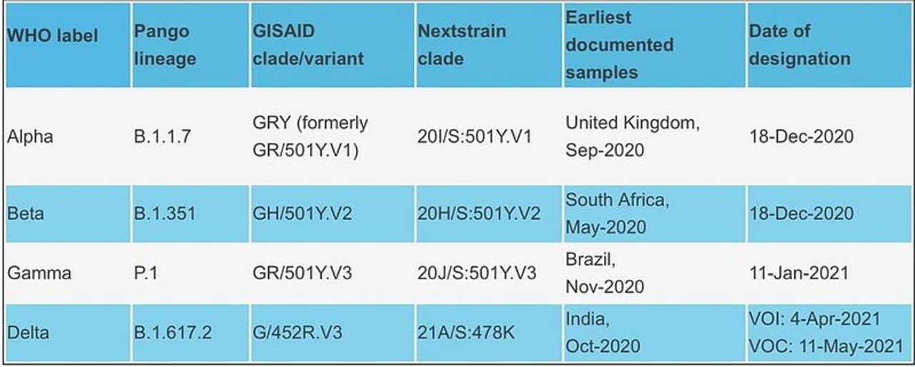 Under the new process, B.1.1.7 (variant first identified in Britain) will be known as Alpha, B.1.351 (variant first spotted in South Africa) will be Beta, P.1 (variant first detected in Brazil) will be Gamma and the B.1.617.2 (variant first detected in India) will be labelled as Delta. The B 6.717.1 variant has been labelled as Kappa