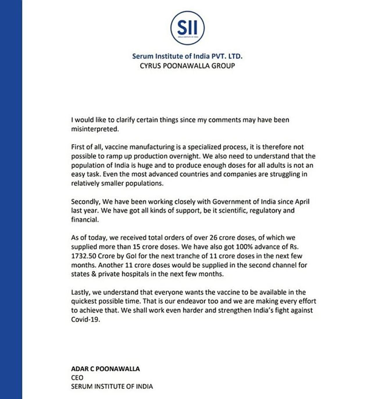 However, the government's assertion was backed by the Serum Institute, which stated that the company remains committed to ramping up vaccine production to save every life it can.