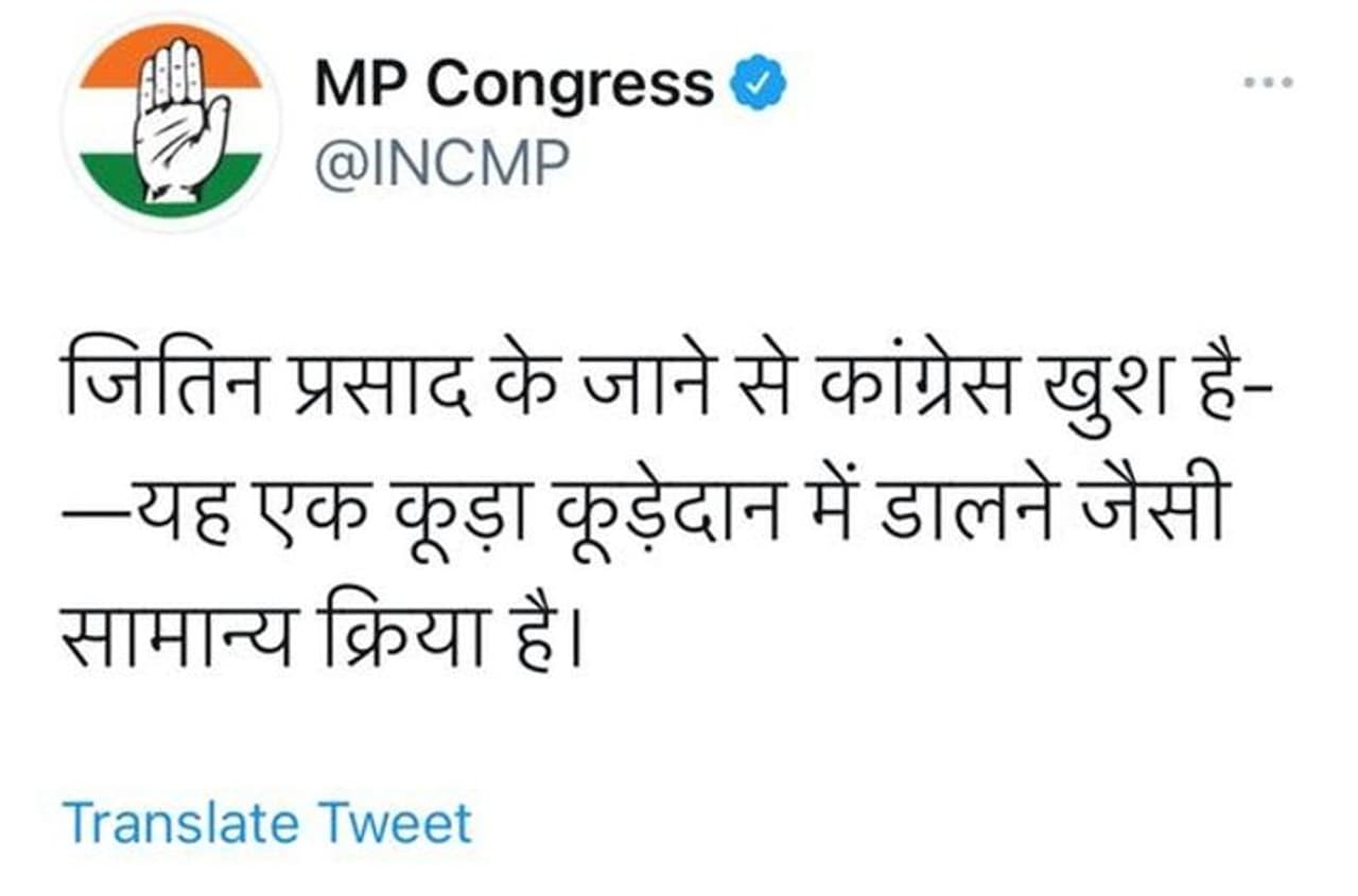 However, the tone and tenor of Congress backlash crossed limits of public decency when the Madhya Pradesh unit of the party equated him to garbage. In a tweet deleted later, the MP Congress said: "Congress is happy that Jitin Prasada has left. It's like garbage has been thrown into the dustbin."