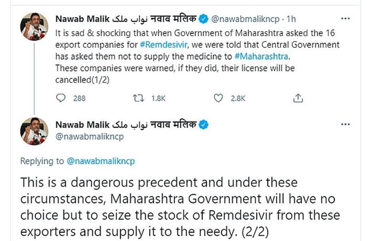 In a series of tweets, Malik said: "It is shocking that when Maharashtra government asked 16 export companies for Remdesivir, we were told that Centre had asked them not to supply the medicine to the state. These companies were warned that if they did supply the medicine, their license would be cancelled."