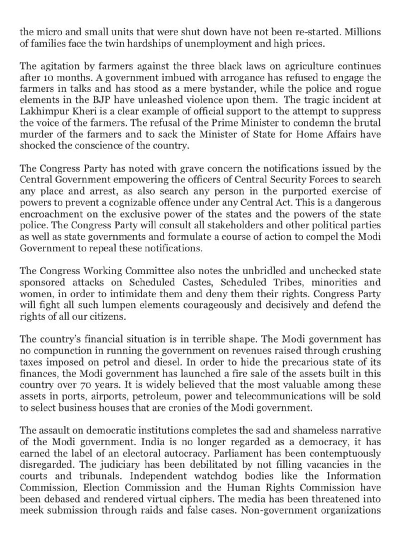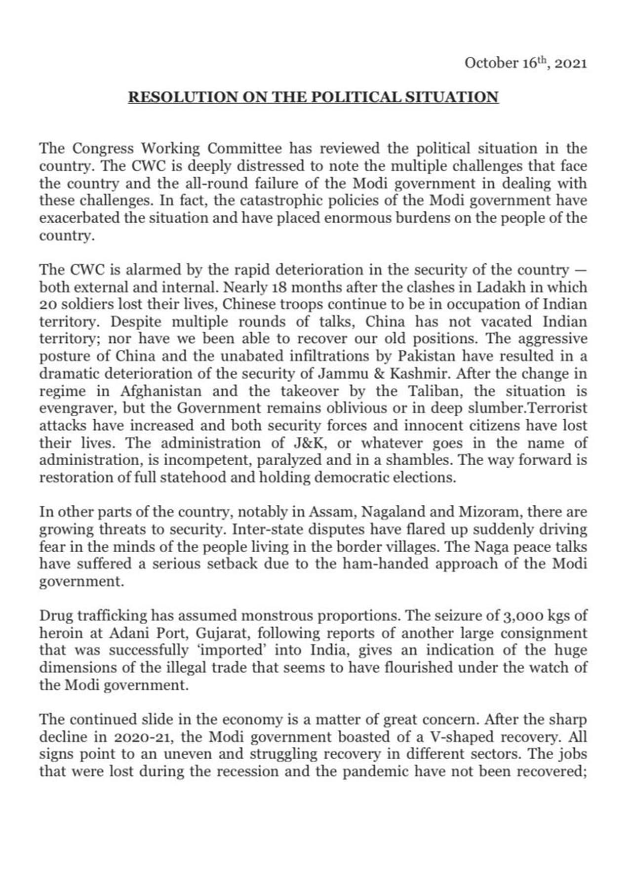 The Congress Working Committee has reviewed the political situation in the country. The CWC is deeply distressed to note the multiple challenges that face the country and the all-round failure of the Modi government in dealing with these challenges. In fact, the catastrophic policies of the Modi government have exacerbated the situation and have placed enormous burdens on the people of the country.