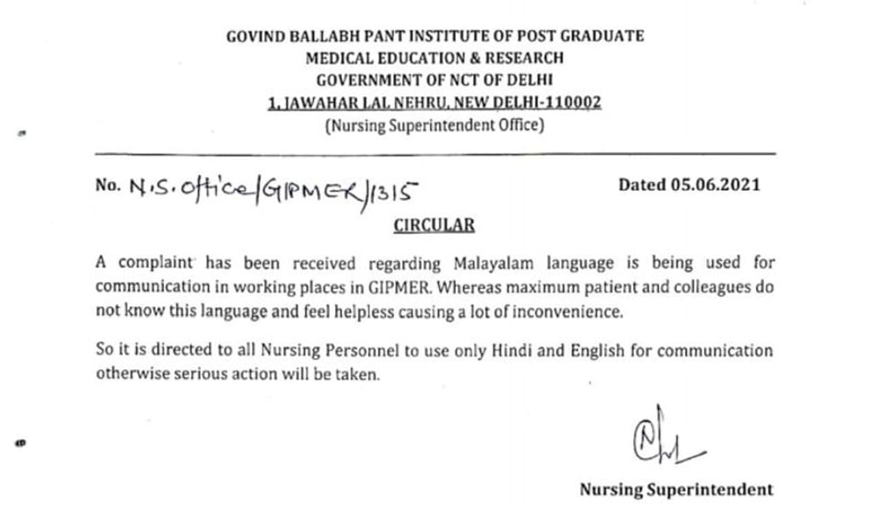 The communication, issued by the Nursing Superintendent, said that complaints had been received about the Malayalam language being used for communication at workplaces in GIPMER.