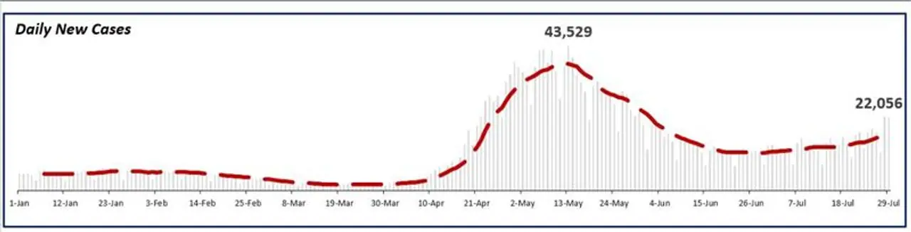 However, from 3rd week of June 2021 to till date, daily new cases in Kerala have seen a gradual and consistent increase. Recently, Kerala reported more than 22,000 new cases in a day. This is more than 50% of the peak witnessed by Kerala in mid-May 2021.