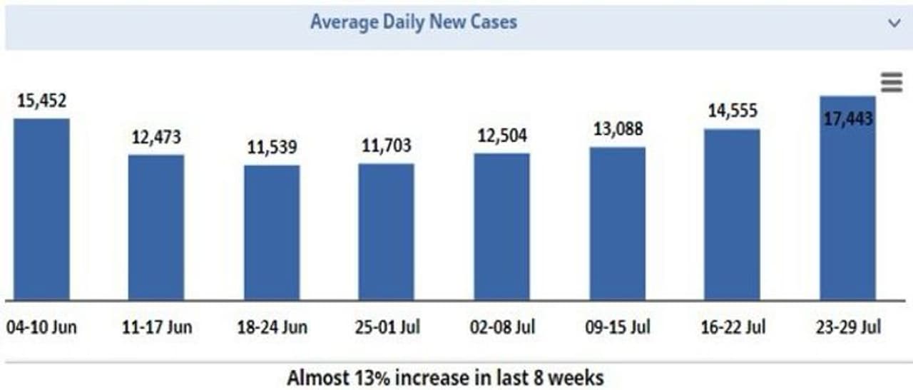 In average daily new cases, in the last 8 weeks Kerala has seen a 13% increase.