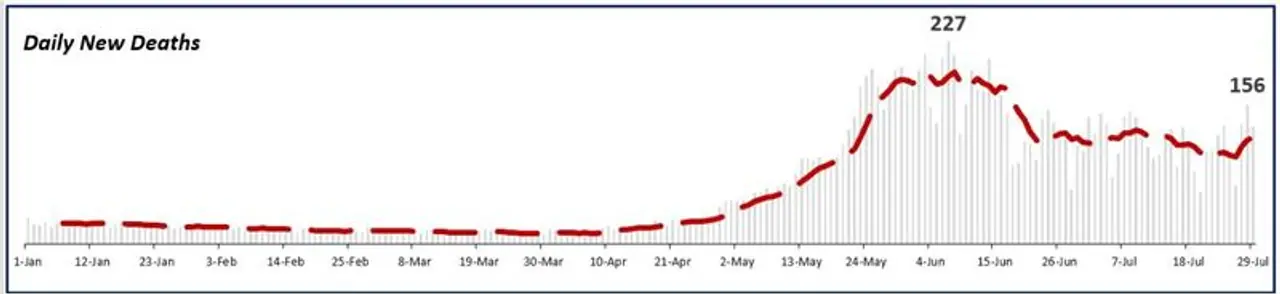 Since 1st week of June till date, Kerala is also reporting high number of daily covid deaths. In 1st week of June 2021, the daily new covid deaths in Kerala were as high as 227 and today they are still high of more than 150 deaths a day.