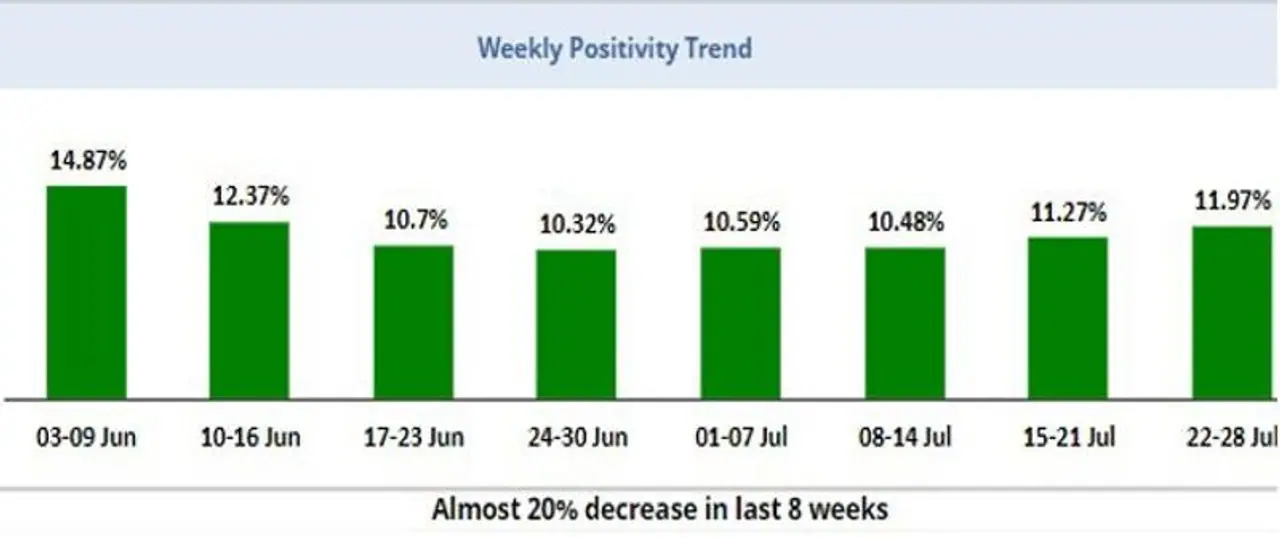 In the last 8 weeks, the weekly positivity trend in Kerala has been between 10.5% to 14.8%. In the last 8 weeks, the positivity percentage has never declined below 10% in the State.