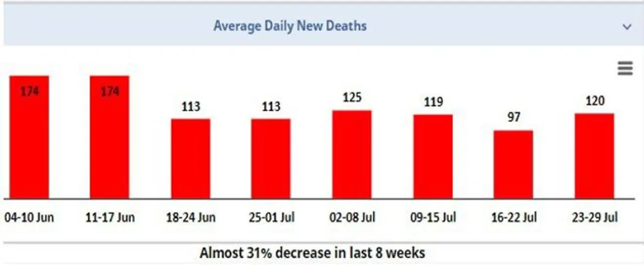 In average daily deaths, in the last 8 weeks Kerala has seen a range of 97 average daily deaths to 174 average daily new deaths.