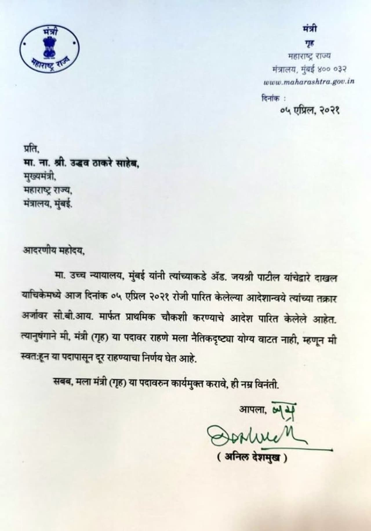 In his resignation letter, Deshmukh said that since the high court has asked the CBI inquiry against him, it will not be morally right for him to remain in home minister's position.