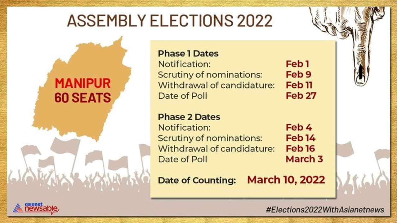 Chief Election Commissioner Sushil Chandra on Saturday announced the Manipur Legislative Assembly schedule which would be held in two phases for 60 seats. The voting will be held on February 27, 2022, and on March 3, 2022, and the results would be announced on March 10, 2022.