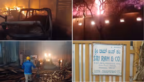 A massive fire broke out early Thursday at the Sriram Wood Factory near Yadavanahalli, Bengaluru, causing extensive damage. The fire, believed to be accidental, spread rapidly, affecting nearby Ashirwad Food and Pipe Companies. Firefighters are working to contain the blaze, with no casualties reported yet.