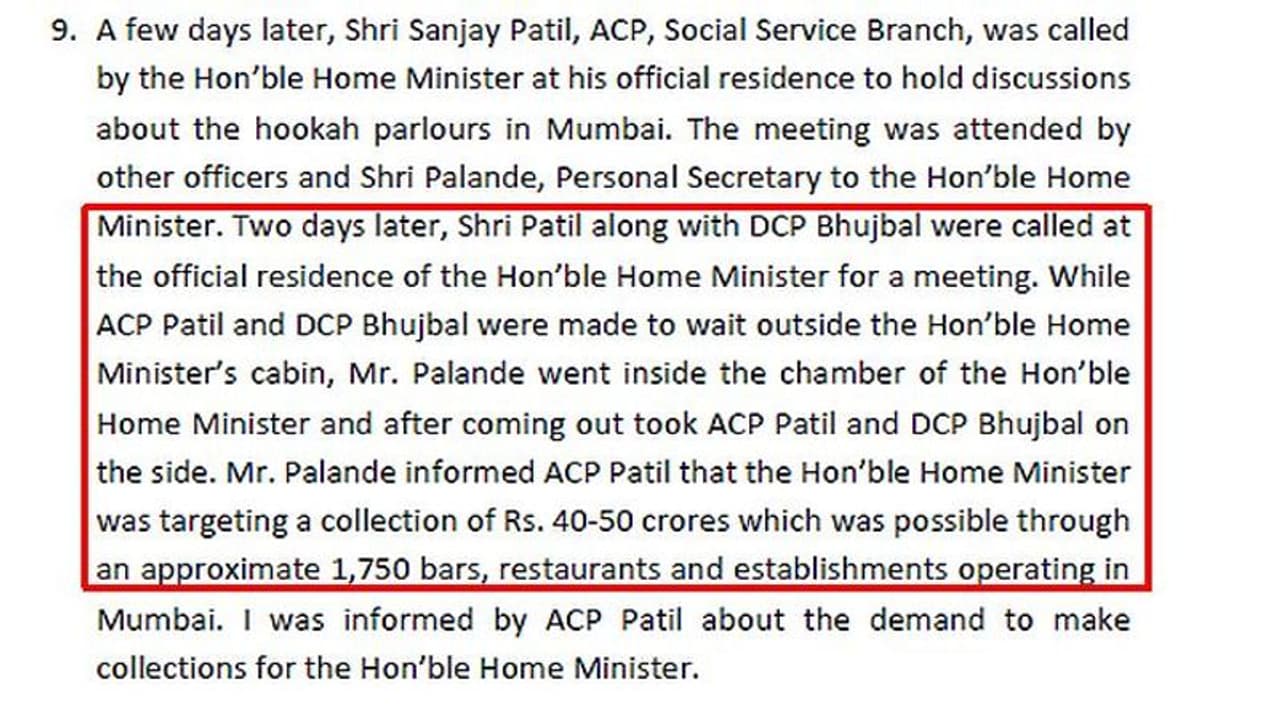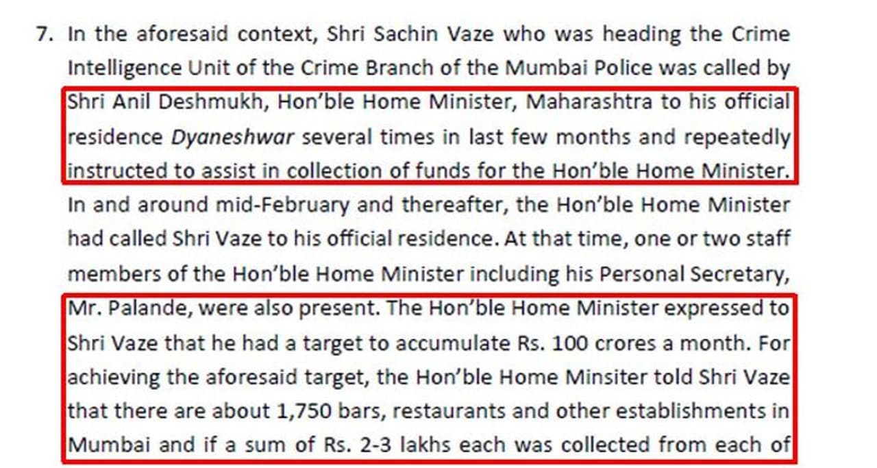 In the letter, Param Bir Singh reportedly states that Deshmukh had asked suspended Mumbai Police inspector Sachin Vaze to extort Rs 100 crore from restaurants, bars and other establishments in the city every month.