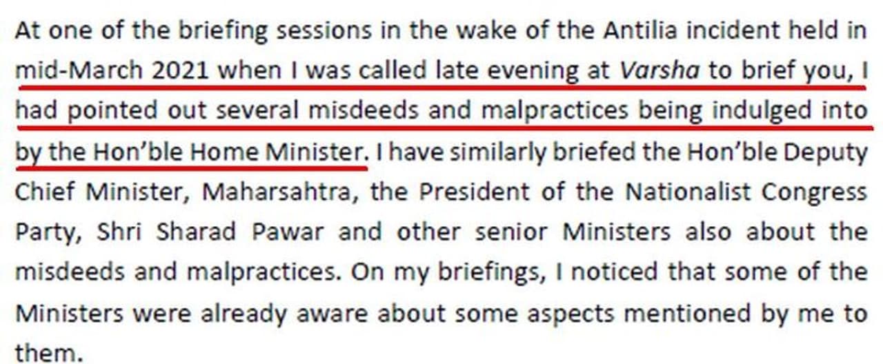 He wrote in the letter that in one of the instances, during the briefing sessions in the wake of the Antilia incident held in mid-March, when he was called late evening to Varsha to brief the chief minister he had pointed out several misdeeds and malpractices being indulged in by the home minister.