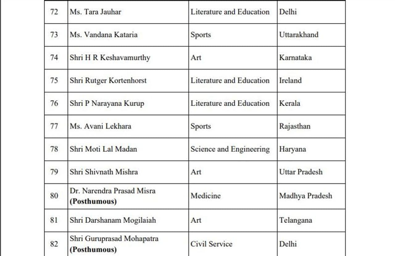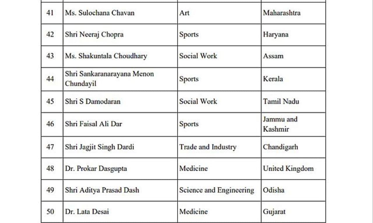 Olympians Neeraj Chopra, Pramod Bhagat, and Vandana Kataria, as well as musician Sonu Nigam, will receive the Padma Shri.