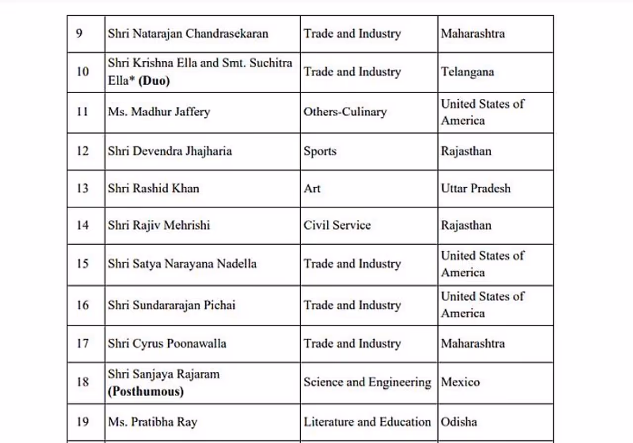 Padma Bhushan awards will also be given to Congress leader Ghulam Nabi Azad, Microsoft CEO Satya Nadella, Alphabet CEO Sundar Pichai, and SII MD Cyrus Poonawalla. Bharat Biotech Chairman Krishna Ella and his co-founder wife Suchitra Ella will get the Padma Bhushan. In addition, former West Bengal Chief Minister Buddhadeb Bhattacharjee will be awarded the Padma Bhushan.