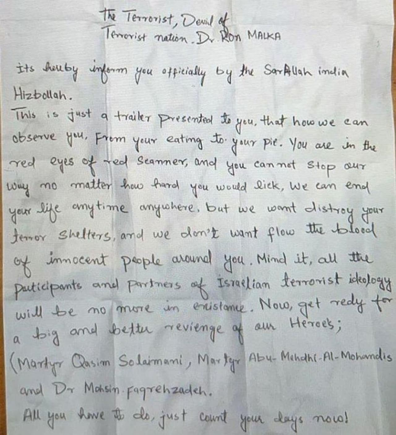 The terror note recovered from near the Israeli embassy premises the day the improvised explosive device went off threatened the country's envoy Ron Malka to prepare a bigger attack.