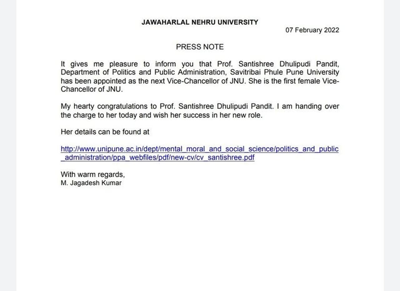 Jagadeesh Kumar in an official statement said, “It gives me pleasure to inform you that Prof. Santishree Dhulipudi Pandit, Department of Politics and Public Administration, Savitribai Phule Pune University has been appointed as the next Vice-Chancellor of JNU. She is the first female vice-chancellor of JNU. My hearty congratulations to Prof. Santishree Dhulipudi Pandit. I am handing over the charge to her today and wish her success in her new role.”