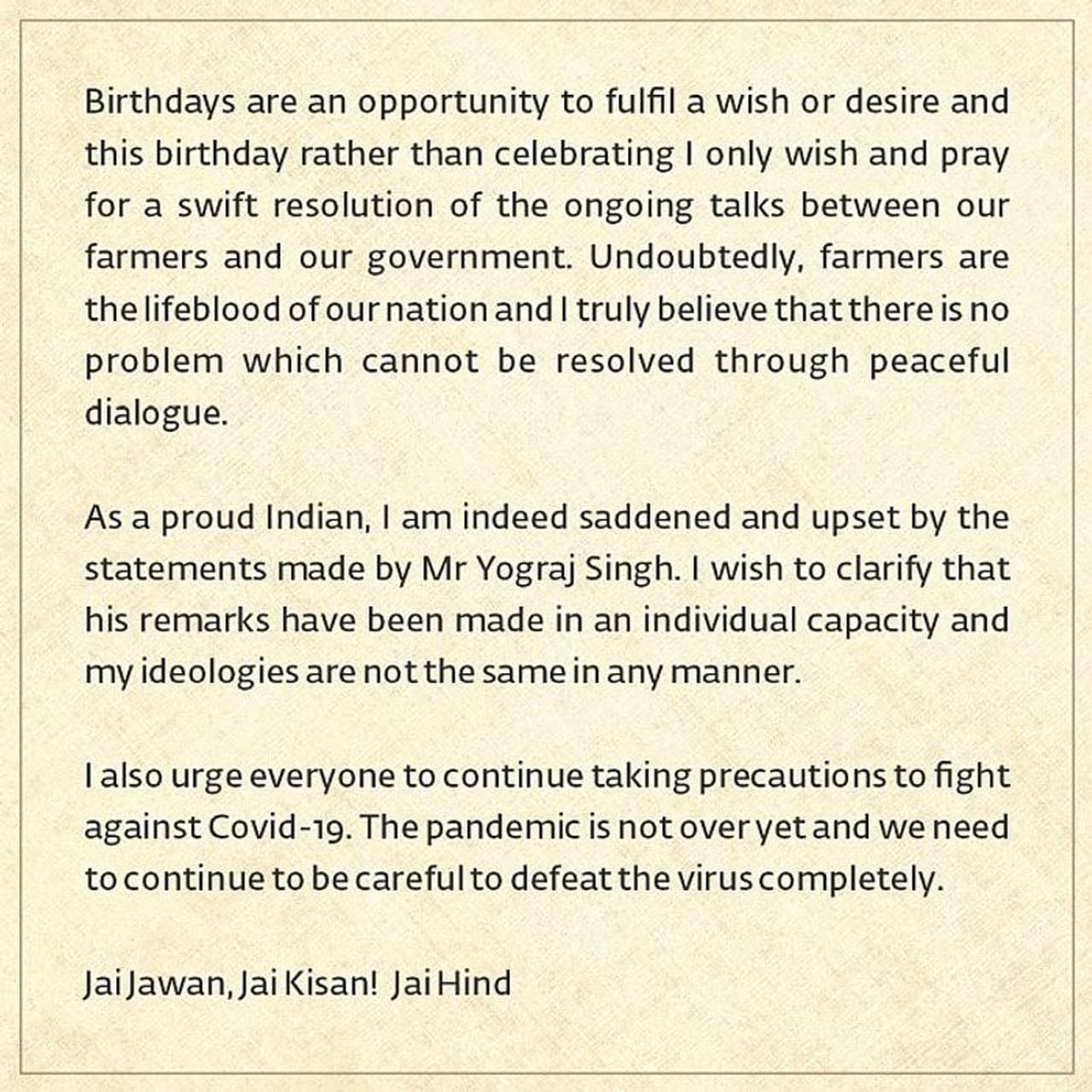 The cricketer further wrote, "Birthdays are an opportunity to fulfill a wish or desire and this birthday, rather than celebrating, I only wish and pray for a swift resolution of the ongoing talks between our farmers and our government."