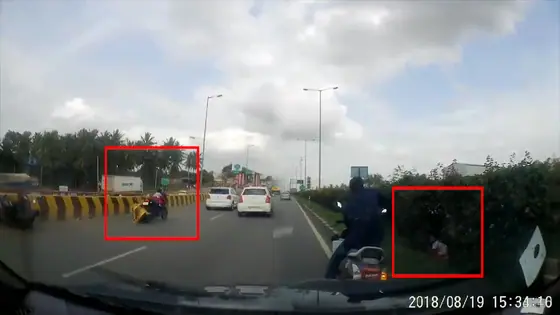 Couple met with an accident on Arishinkunte road, Nelamangala, in the outskirts of Bengaluru. Channaparameshwar, Renuka and their kid were travelling back to the city. By 3.30 pm, their bike hit another bike and both husband and wife fell down. The impact of the accident was so much that the bike went ahead for 300m with the child on it before slowing down. The kid fell on the grass unhurt. The couple suffered minor injuries and are getting treated at a private hospital. The accident was caught on a car’s dashboard camera, belonging to Karthik Gowda in Bengaluru.
